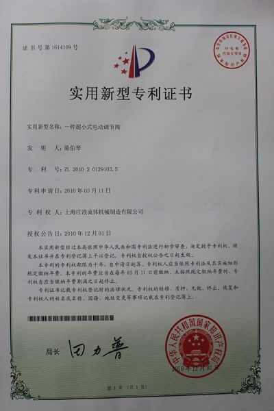 气动程控阀实用新型专利证书