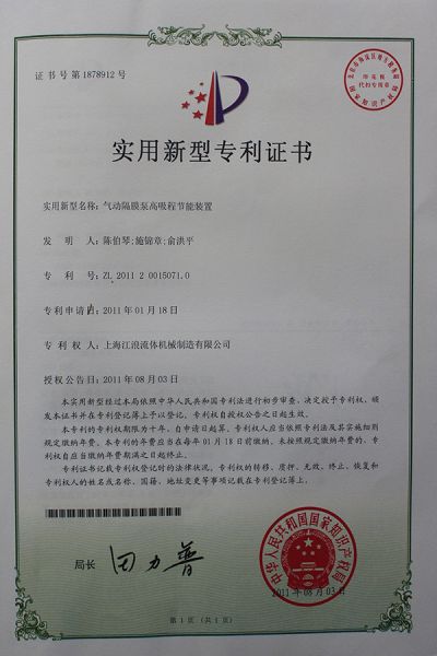 气动隔膜泵高吸尘发明专利证书